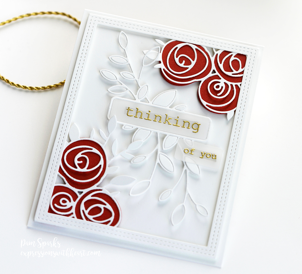 I die cut and glued the Scribble Rose Trio die cuts behind the poppystamps largest Double Stitch Rectangle Frames die.  I cut strips of mounting tape and raised it up a little off the cardbase…mounting tape behind the roses too.