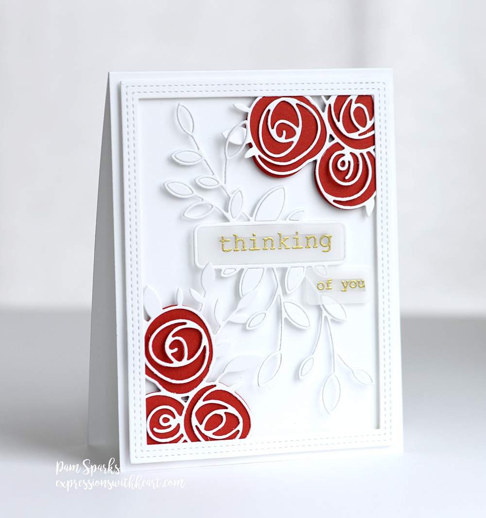Hi everyone! It’s snowing here… not a lot but enough to brighten it up which is so nice!  This white card makes me think of snow too!  I love how this turned out… beautiful new Memory Box Scribble Rose Trio die combined with an earlier release Antique Leaf Label.  So pretty!