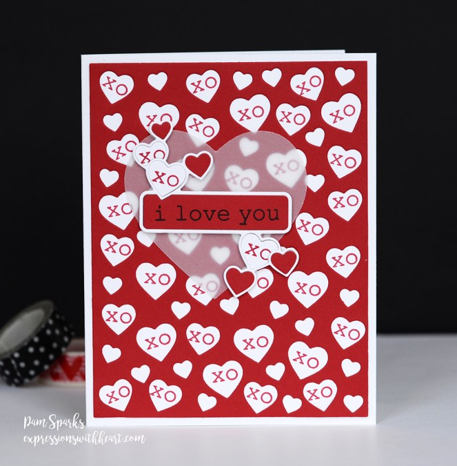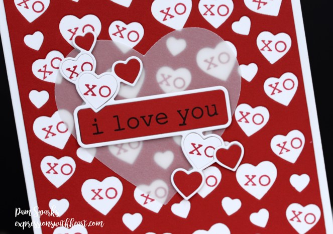 I die cut the new Memory Box Antique Heart Label die in white and red cardstock too. For this card I used parts of both cuts as you can see in the pictures. I did a little more XO stamping and stamped i love you in the label cut from the same stamp set.