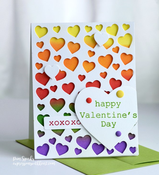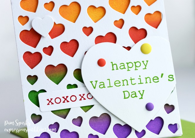 So much to look at! I love how the heart label fits right in on the first card, and that darling tag and envelope on the second. I raise my hand about the ink pads. Love the blending! Your little matte sprinkles are exact matches to your ink colors. This was fun, Pam!