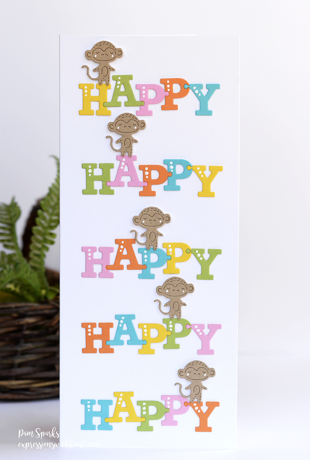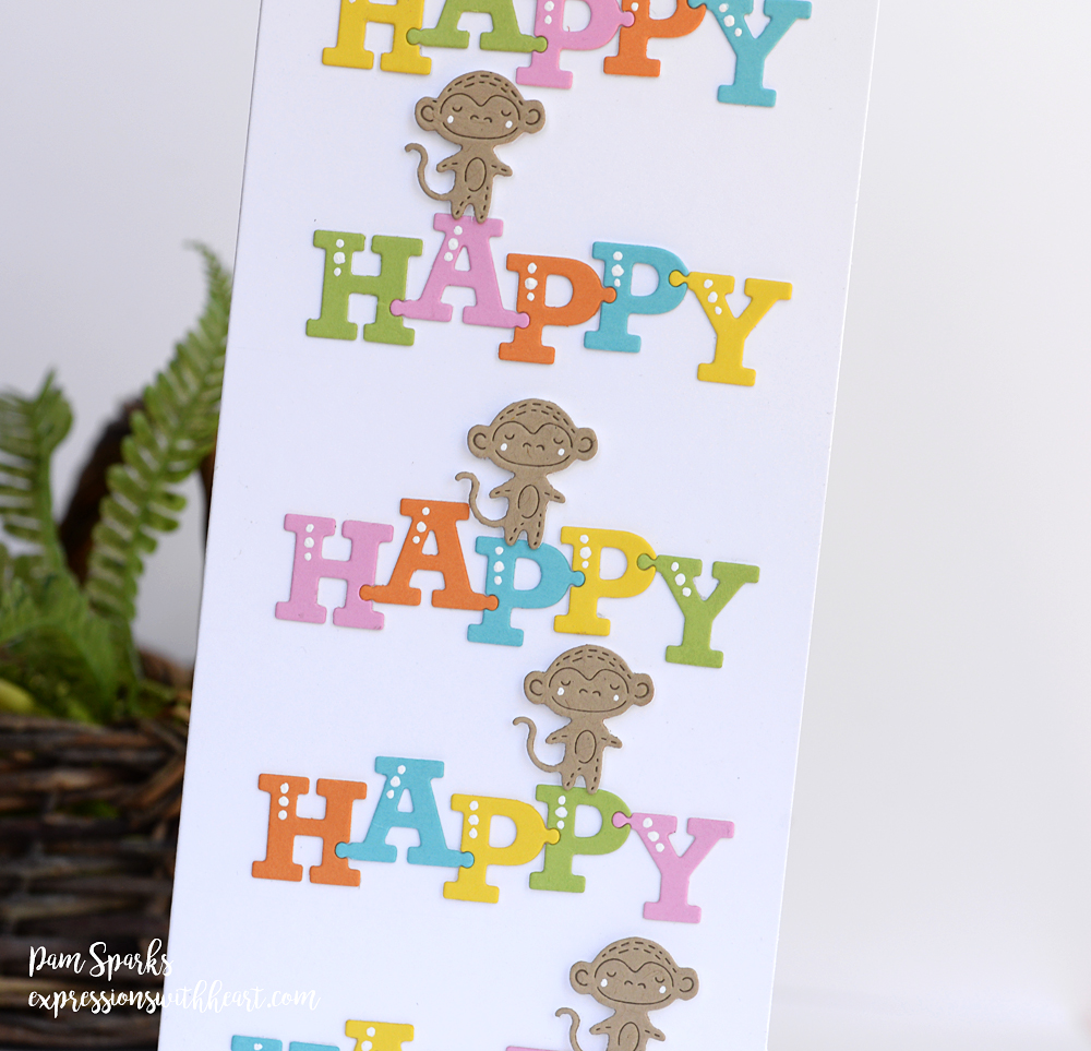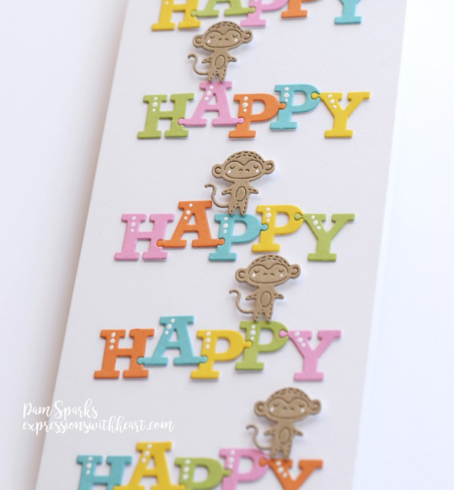 I die cut the Happy die in five colors of Taylored Expressions cardstock and used all the letters by mixing them up and adding white gel pen dots.  I die cut five monkeys from TE Toffee cardstock, added a white gel pen dot on their cheeks, then mounted them with foam mounting tape to the card after I glued the Happys on the card front.