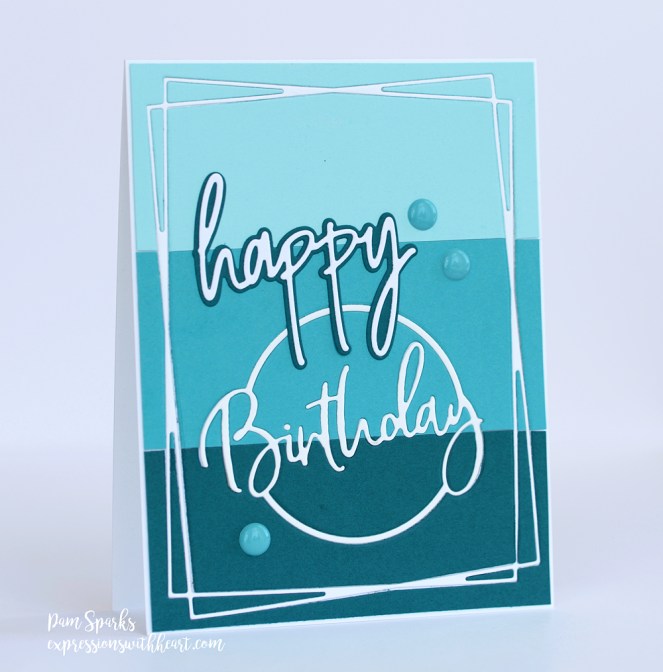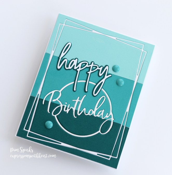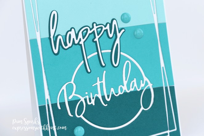 I used the NEW Stylish Rectangle Trio die and the NEW Birthday Cursive Script Circle for this card and inlaid them both in the card panel that I pieced together with three Bazzill Card Shoppe cardstocks, HERE
