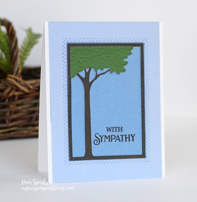 I wanted to make something cool with this NEW Leafy Tree die… it looks Summery anyway!  I also used the NEW Double Stitch Rectangle Cut Out die set… I like it a lot!  I die cut the Leafty Tree Frame in TE Peapod cardstock and colored the tree trunk with a dark brown Copic Sketch Marker!  It covers the green really well!