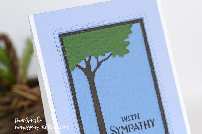 I love how the leaves can be embossed with this Leafy Tree Frame die and then inked with a little stamp pad ink.  I used TE Peapod ink to match the cardstock. The background is Tumbled Glass Oxide ink brushed on to a Toffee/kraft piece of cardstock…same as the card front. I like the look it gave as compared to using it on white.