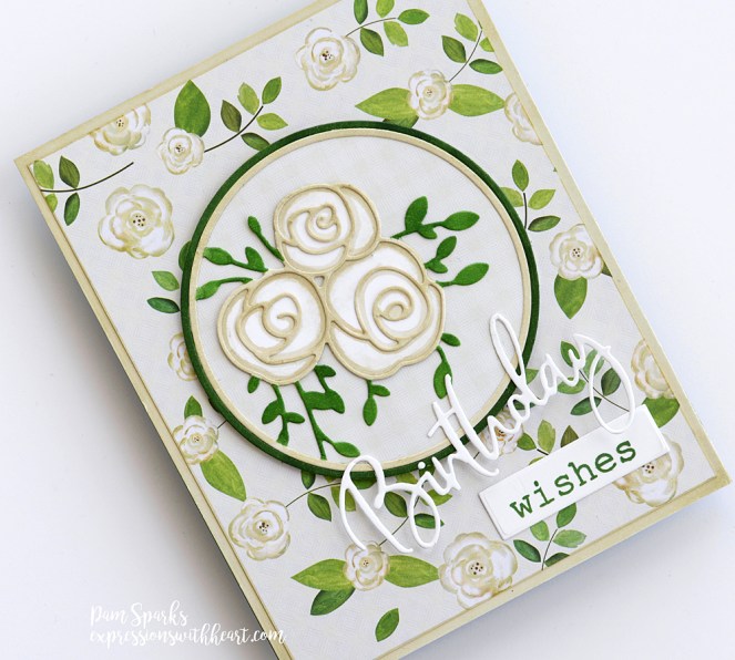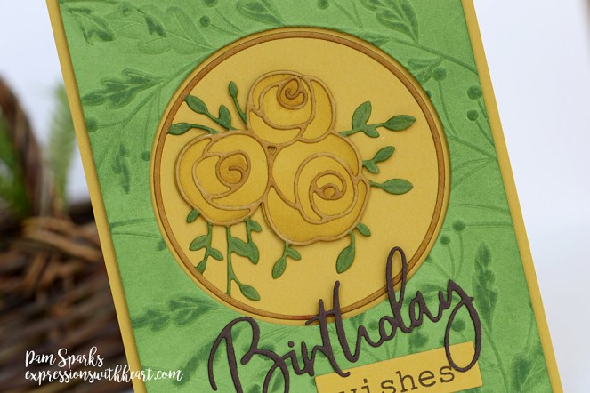 This card I cut a circle from the embossed panel and mounted it to the card base with foam mounting tape.  The Rose Trio die is recessed a little then… I really like how it looks. The word ‘wishes’ is from the  Big and Little Words clear stamp set