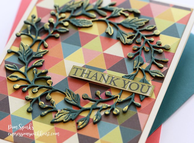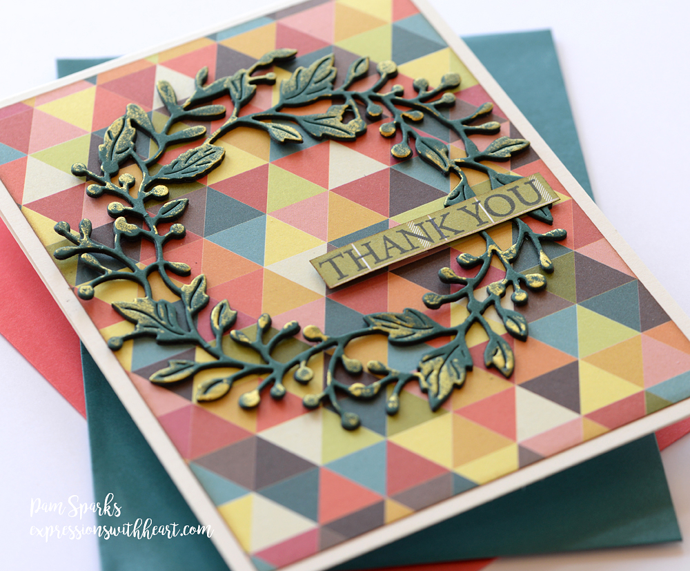 So I pulled out the NEW poppystamps Adriana Wreath die, die cut it three times with a dark blue green cardstock, glued them together and then wiped on some gold watercolor paint with my finger.  Pictures don’t do it justice!  😀