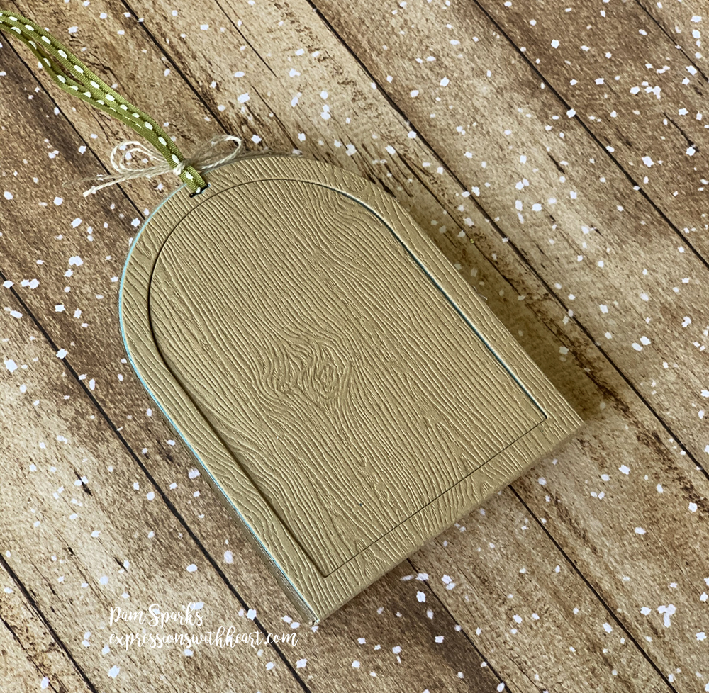 I die cut the Cabin Snowglobe die twice, once in woodgrain and once in Toffee. I cut the trees off the woodgrain die cut.