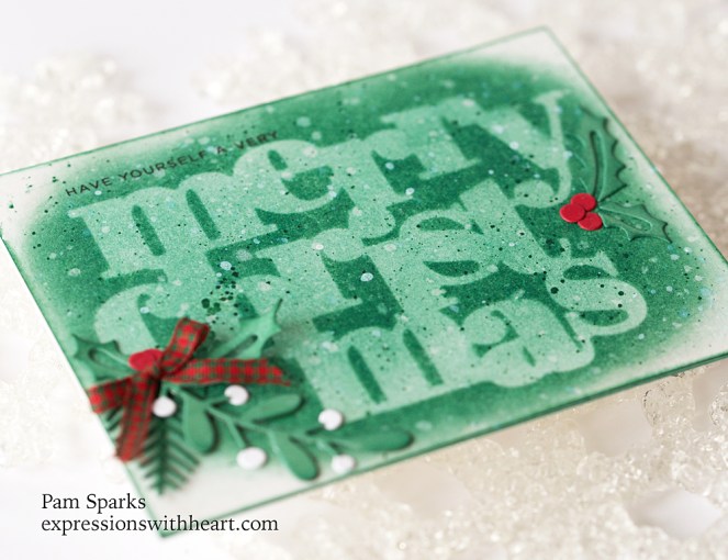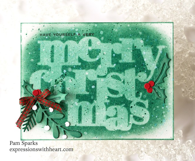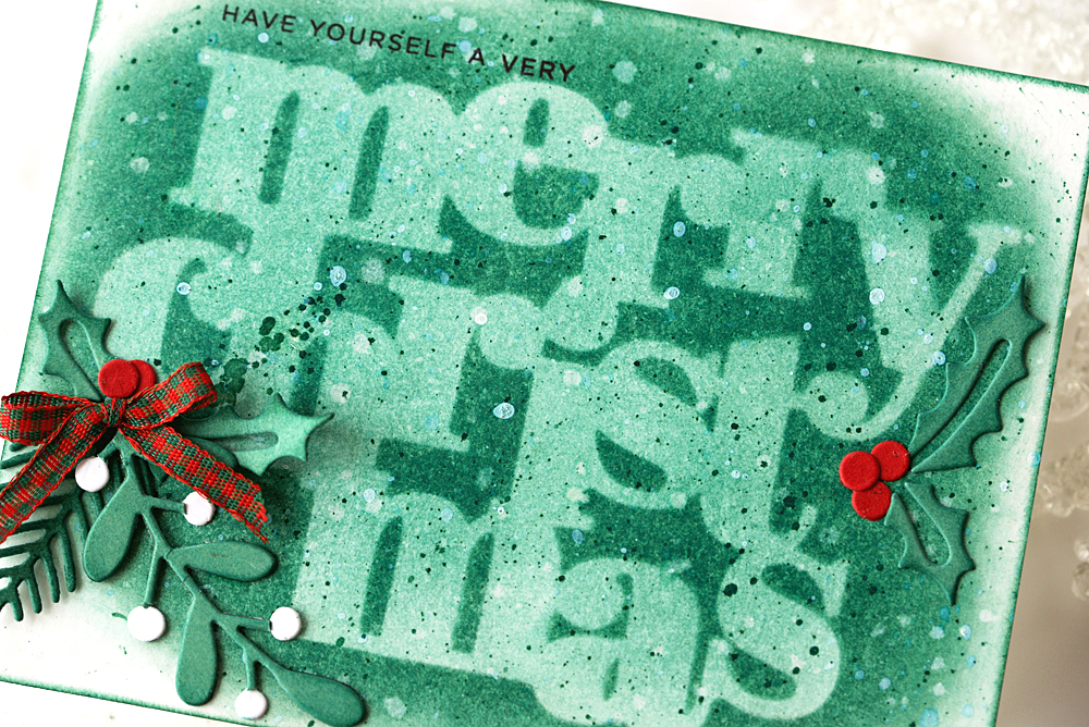 For my card I used the Bold Merry Christmas Stencil, the sentiment is from the Chunky Christmas stamp set and I embellished with Christmas Foliage die set. I’ll link below. They’re on sale!