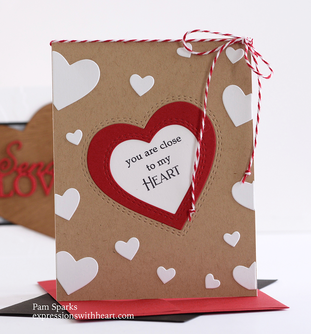 I used the new Memory Box Sprinkle Heart Collage in kraft color and red cardstock.  The two complete hearts are from the smallest heart in the Memory Box Double Stitch Loving Heart Cut Out die set.