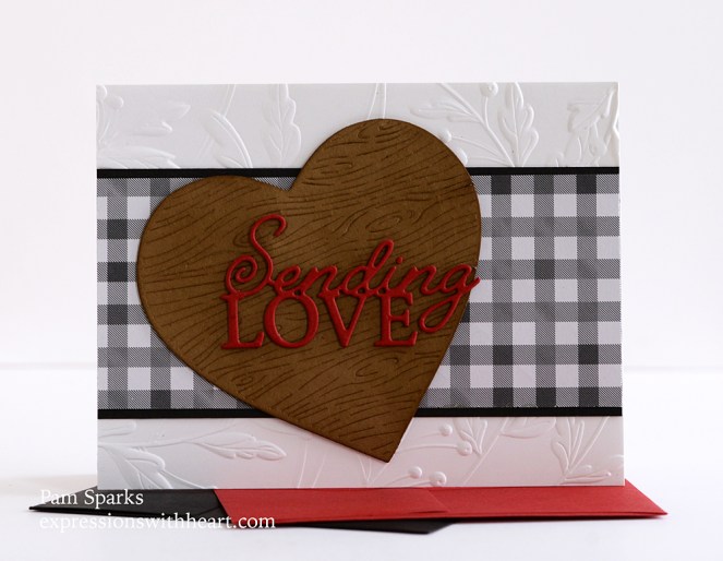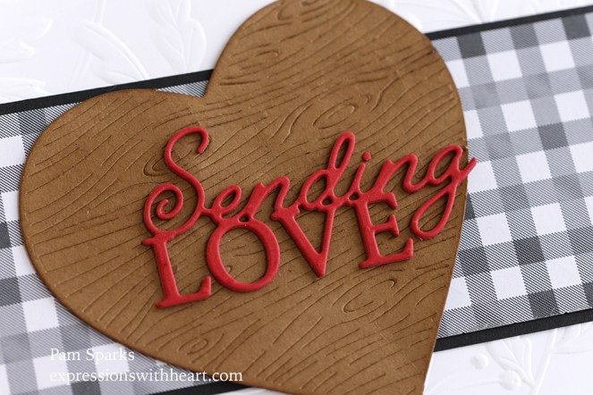 I die cut and inked the new Memory Box Woodgrain Heart and then die cut the new Sending Love Posh Script 3 times in red, glued them together and adhered to the heart.