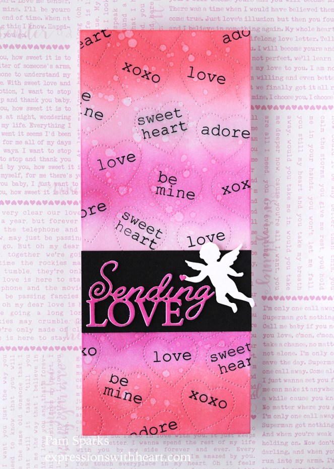 I die cut in Neenah 110# solar white cardstock with the NEW Slim Pinpoint Heart Plate. I inked with regular Distress inks and the mini foam ink blending tools. Spun Sugar, Worn Lipstick and Picked Raspberry.
