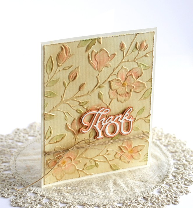 Hi everyone!  I was trying for a vintage look with this NEW embossing folder… it turned out pretty and feminine!
