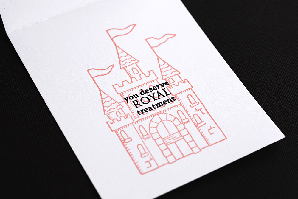 The sentiment is from the new Memory Box Majestic Achievements stamps and die set. I stamped it on the peachy pink color and trimmed it and layered it on the white die cut.  You wouldn’t need to do this but I did a lousy job stamping it on the die cut piece so I cut it out! lol  Super cute castle stamp, sentiments and banners.