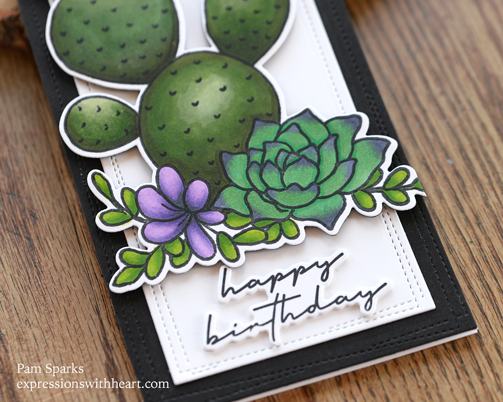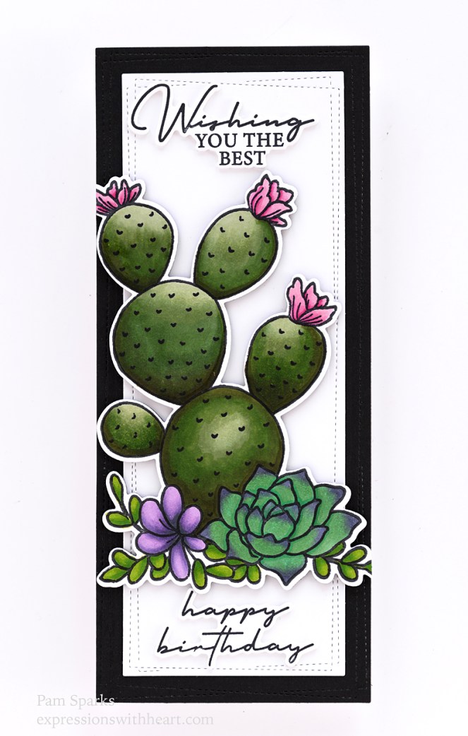 I stamped the NEW Memory Box Flowering Cactus in the MISTI with Tuxedo Black Memento ink, die cut it and colored it with these copics…
