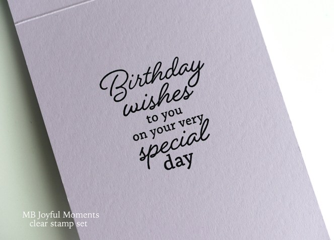 On the inside I stamped this sentiment from Memory Box Joyful Moments clear stamp set with Ranger Archival Black ink.