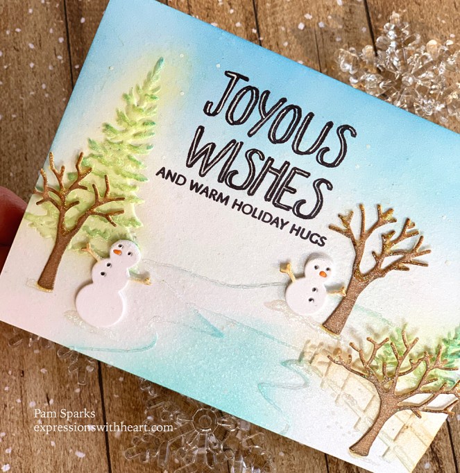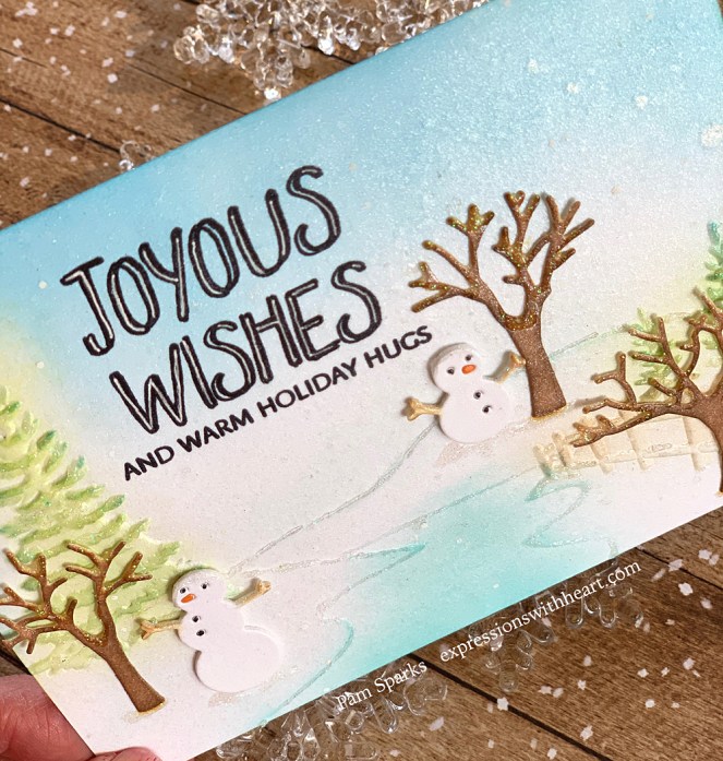 I hadn’t use the new poppystamps Snowman and Trees die set yet so I thought it would be perfect in this shimmery snowy scene.