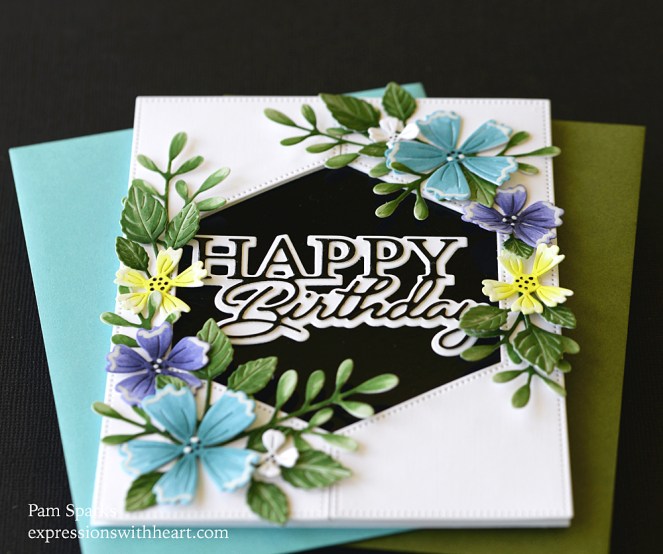 I started with an A2 size cardbase. Topped it with a panel of the NEW Memory Box Black Glossy Cardstock.  It’s heavyweight and die cut so nice for the Happy Birthday sentiment too!