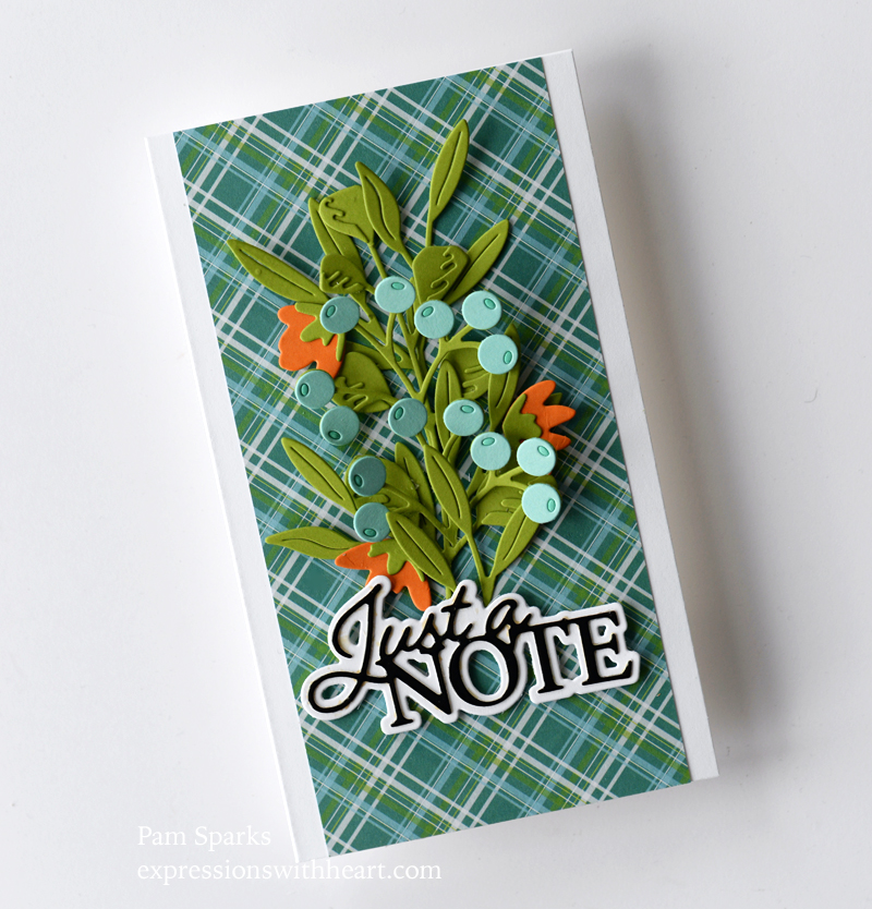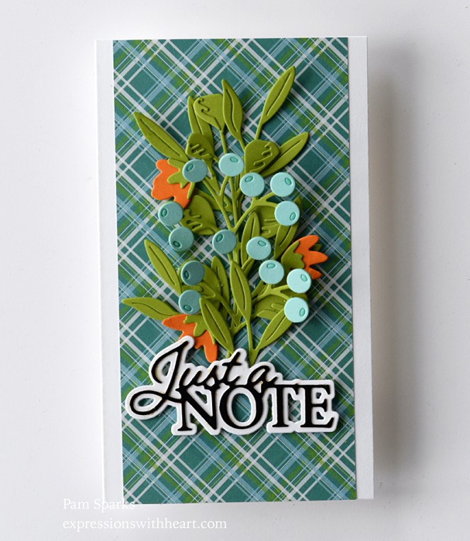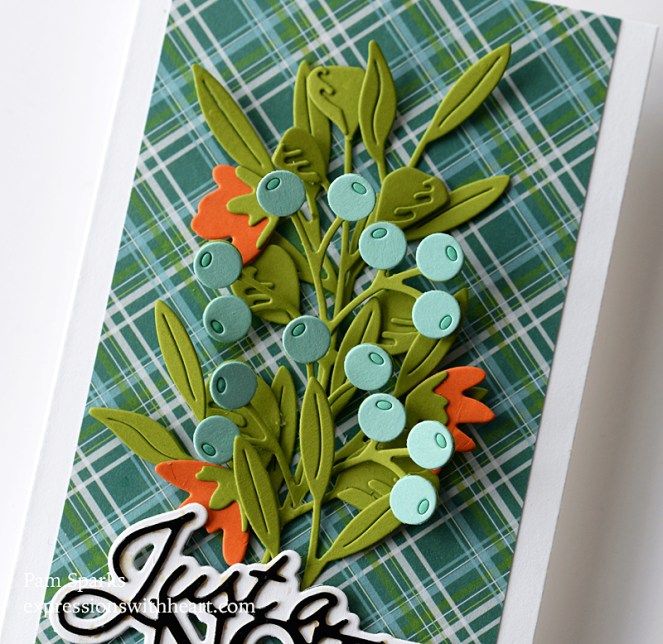 The berries are a bit bluer in real life…pretty sure it’s Taylored Expressions Cookie Monster cardstock and the flowers are Taylored Expressions Candy Corn cardstock.