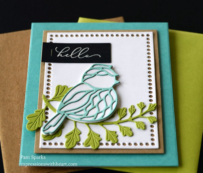 I also used the NEW from the last release Stained Glass Bird die and from a release before that, the Fine Textured Leaf die set. I die cut the bird in white three times, keeping the pieces intact, glued them together and then die cut one in blue/green and glued it on top I love all the detail in the leaves and the shapes!