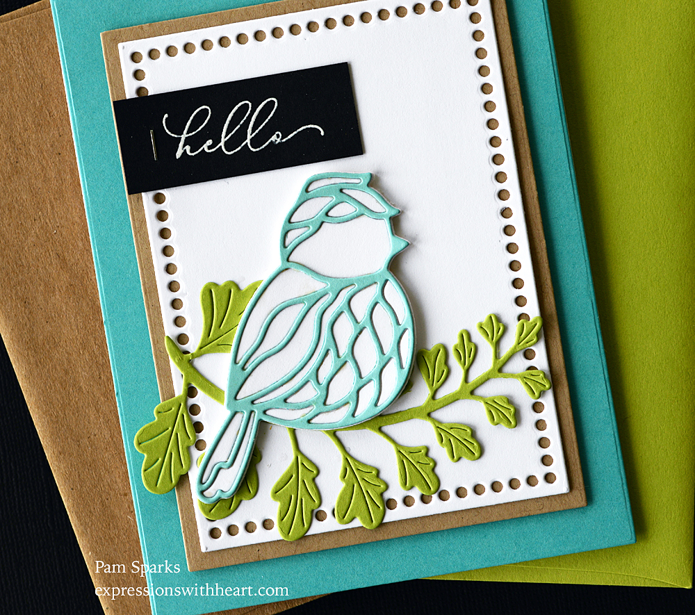I also used the NEW from the last release Stained Glass Bird die and from a release before that, the Fine Textured Leaf die set. I die cut the bird in white three times, keeping the pieces intact, glued them together and then die cut one in blue/green and glued it on top I love all the detail in the leaves and the shapes!