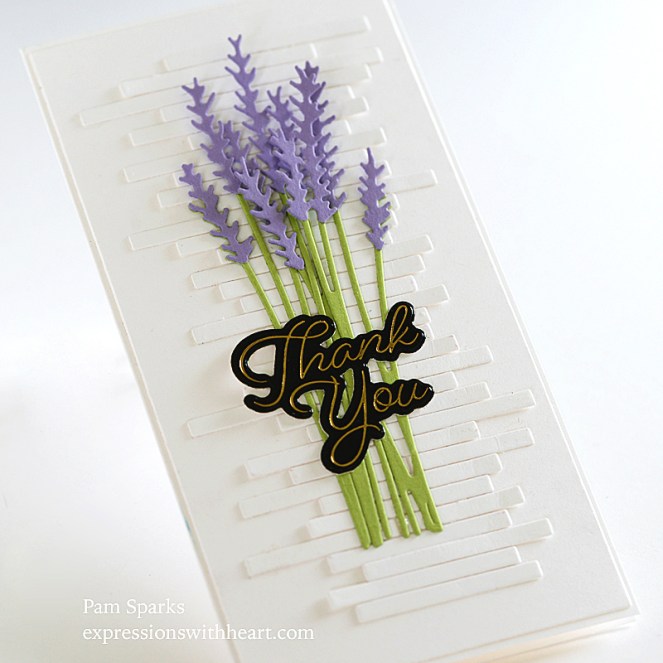 I started with a mini slimline panel. Then I was thinking backgrounds…I love Memory Box Collage dies and I grabbed the Jumbled Line Collage and found all the positive pieces from cutting a few times in the envelope! YAY! Make my own tile/brick looking wall to show off the lavender!