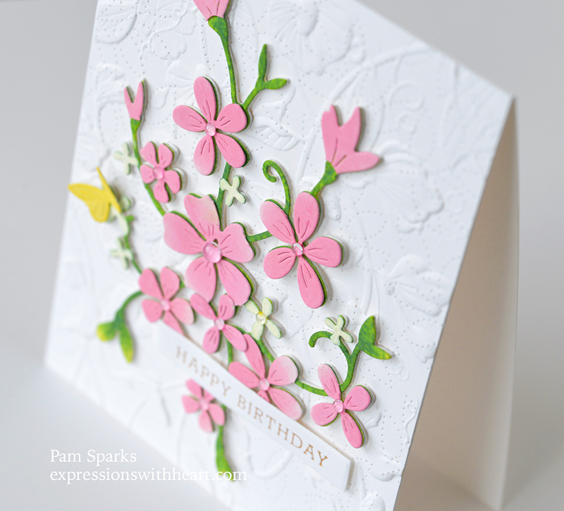 Lovely layers and divine details – so loving this embossed background, and that hint of yellow near the butterfly – absolutely exquisite Pam!!