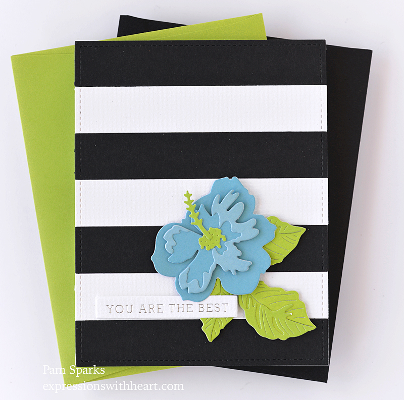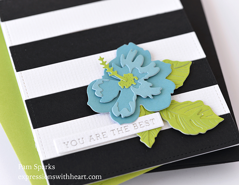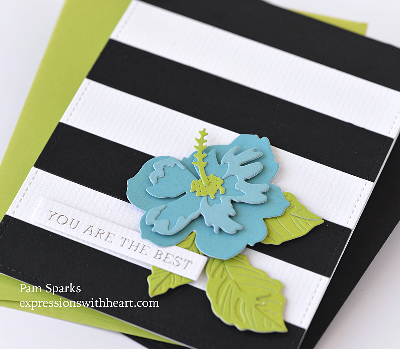 The NEW BPD Star Flowers Contour Layers die set and the BPD Fuddled Leaf Branches Contour Layers die set (smaller branch) on this card… same as the Hibiscus.  You can see the marks where to place the layers… love that! No guessing or wondering if you got it in the right place.