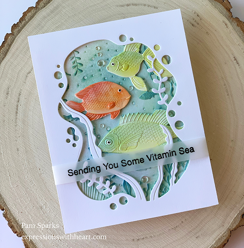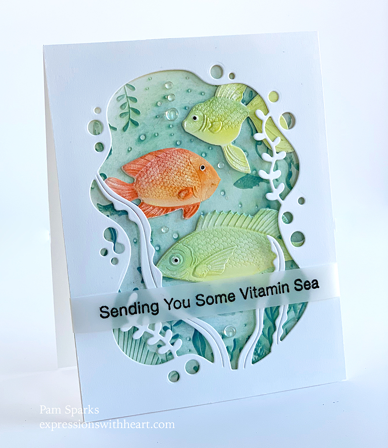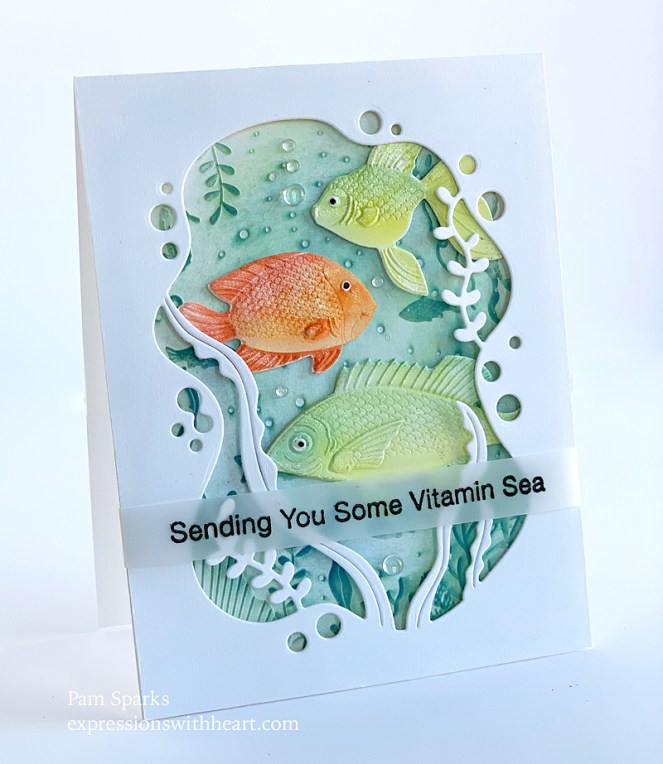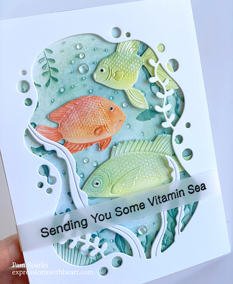 4. I don’t know if there are enough ways to say how much I love this! I bought the fish with stencils and more and it’s really nice to see how totally fabulous they look with the brushed ink through the stencils. Now I wish I had this underwater die, but where does it stop? I have plenty, sheesh. Thanks, Pam!