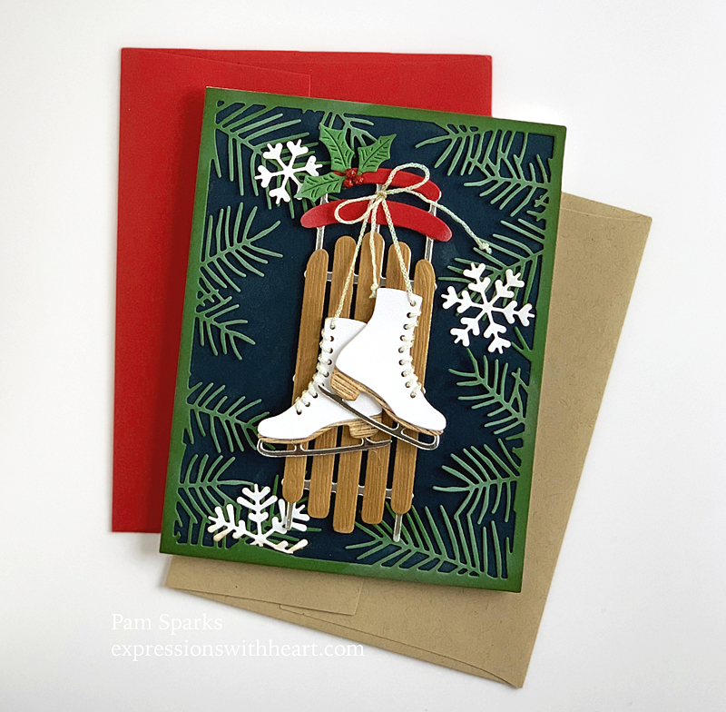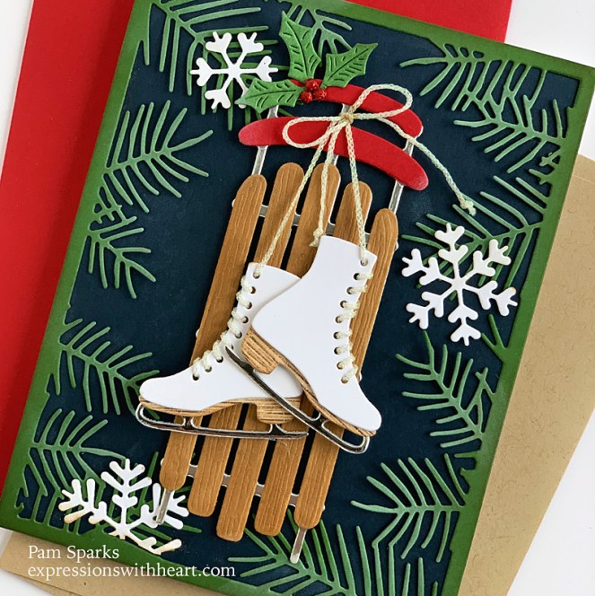 1. Oh Pam…your cards are always so stunning. I just LOVE the Pine Needle Frame…the perfect setting to insert the Sled … I also LOVE the lacing on the Skates.
