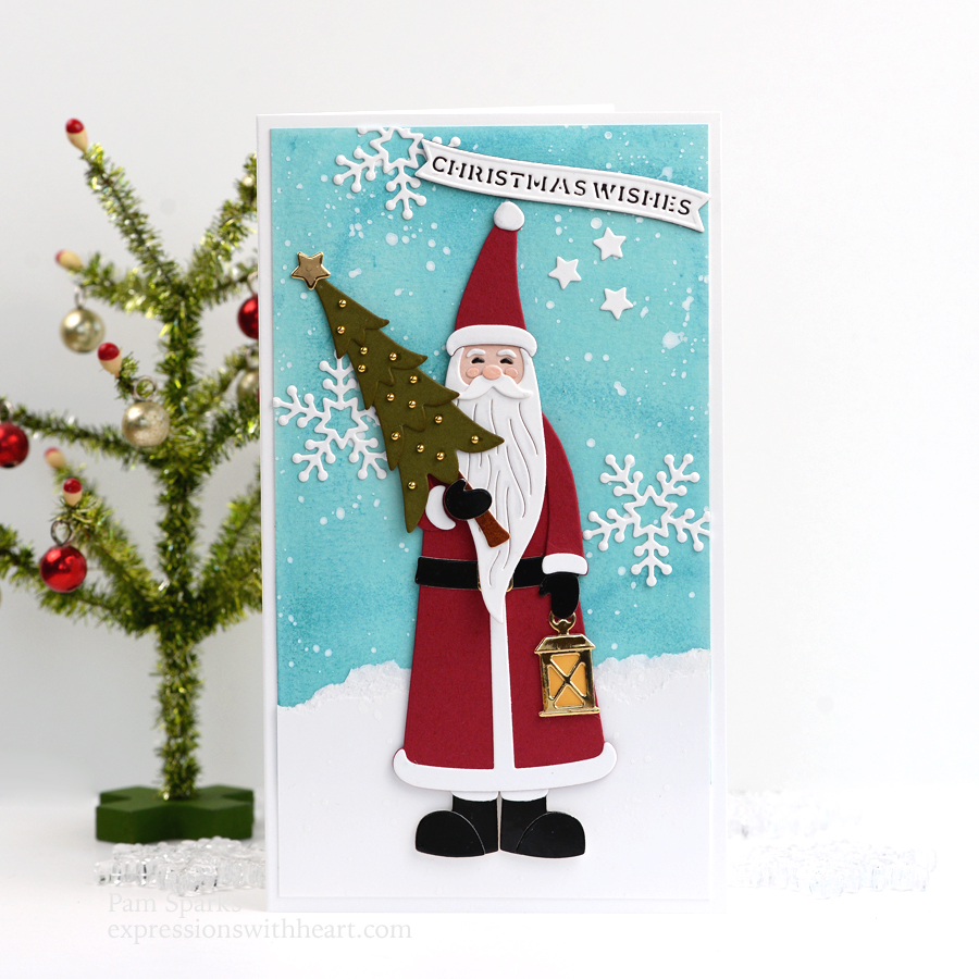 Die cut and assemble St.Nick, the lantern and the tree. There’s even a die for a piece to back the lantern!