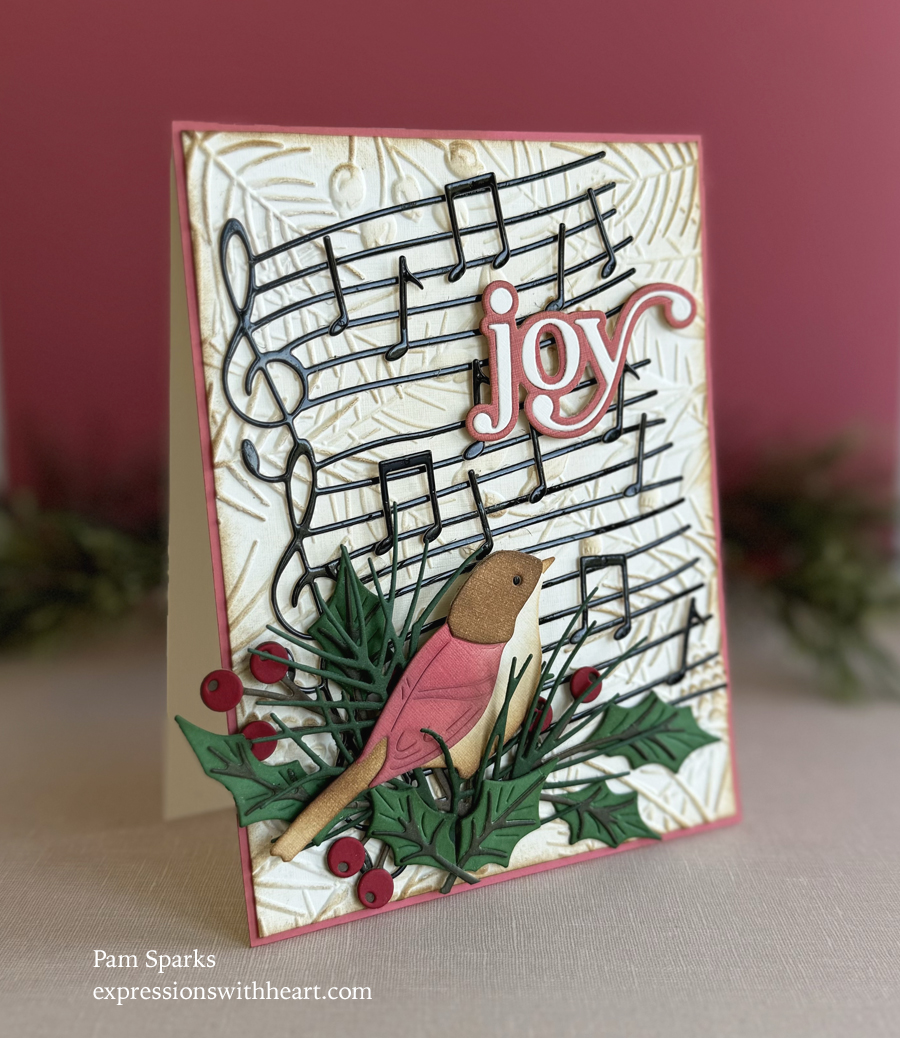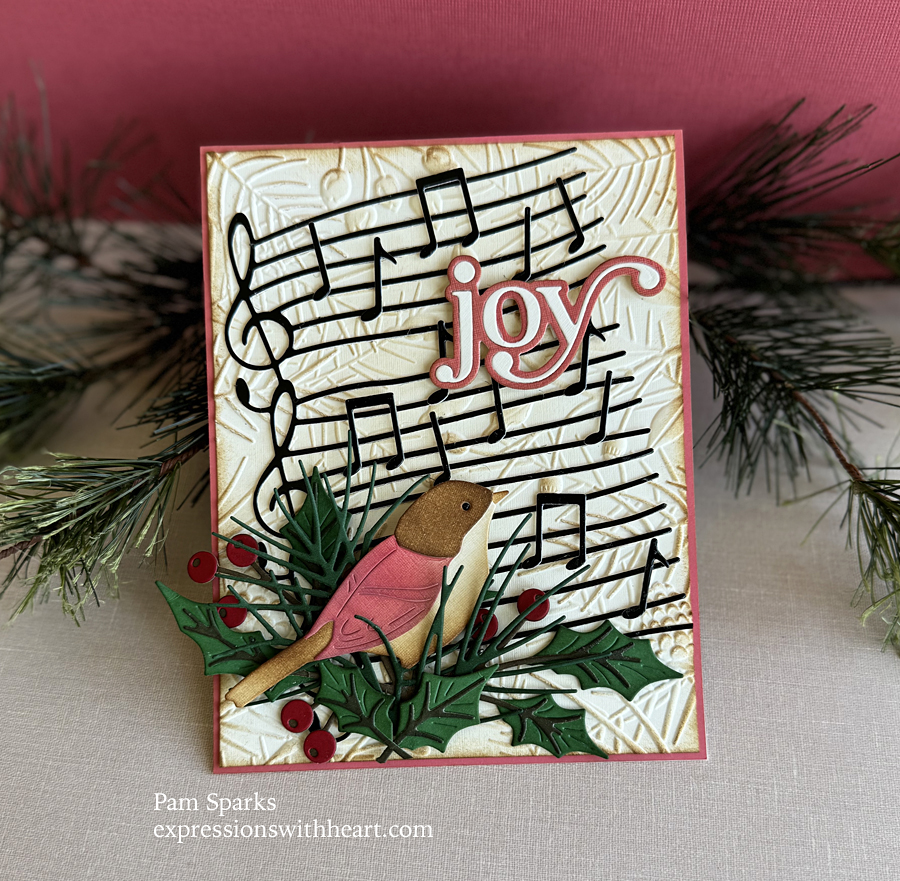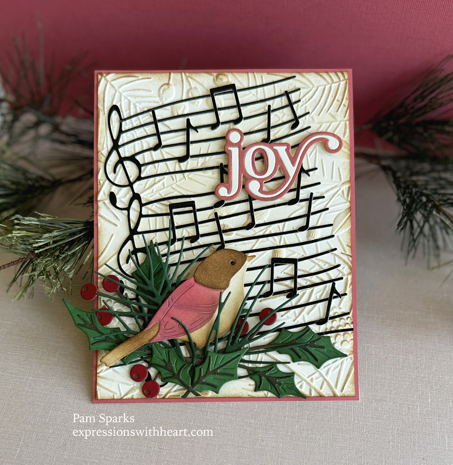 Layered on top of the NEW Pinecone and Berries 3D Embossing Folder with natural linen cardstock, then the NEW Wavy Sheet Music die cut in black glossy cardstock.