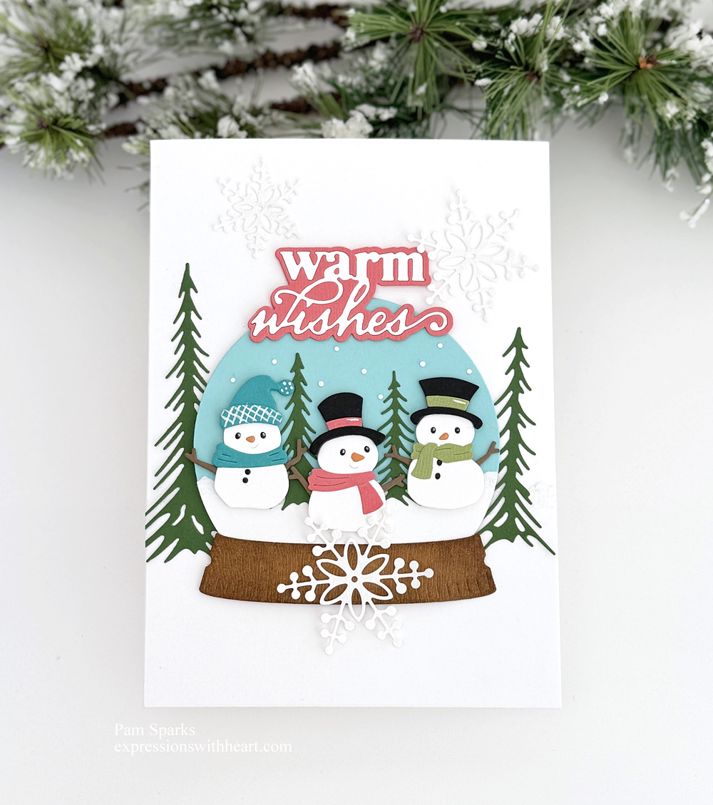 It’s mostly still available dies, I’ll link you up below.  Very basic die cutting and gluing…a little white pen.  Oh I inked the snowglobe base with Gathered Twigs Distress ink and the mini ink blending tool.