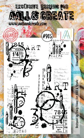 I randomly stamped the images from AALL & Create Elemental Notes #905 in black ink on a panel and ink blended with two colors. Spattered with white ink.