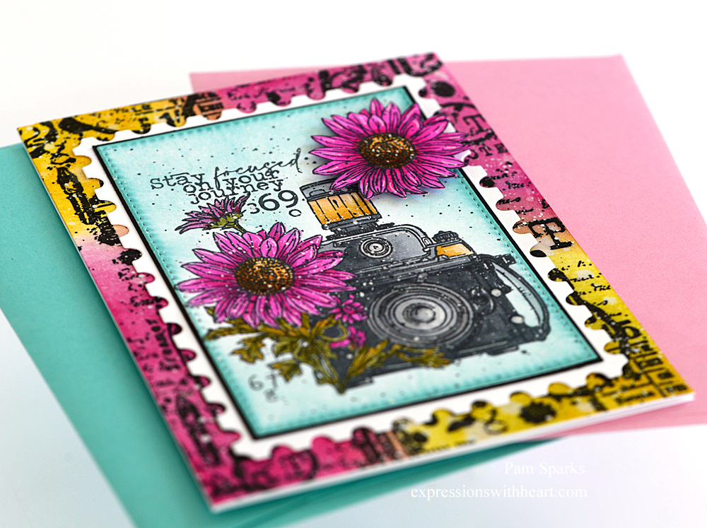 The camera is from ALL & Create Lens & Lines clear stamp set. I stamped part of it again so I could have the extra flower. I fussy cut it out and mounted it with thin mounting tape.