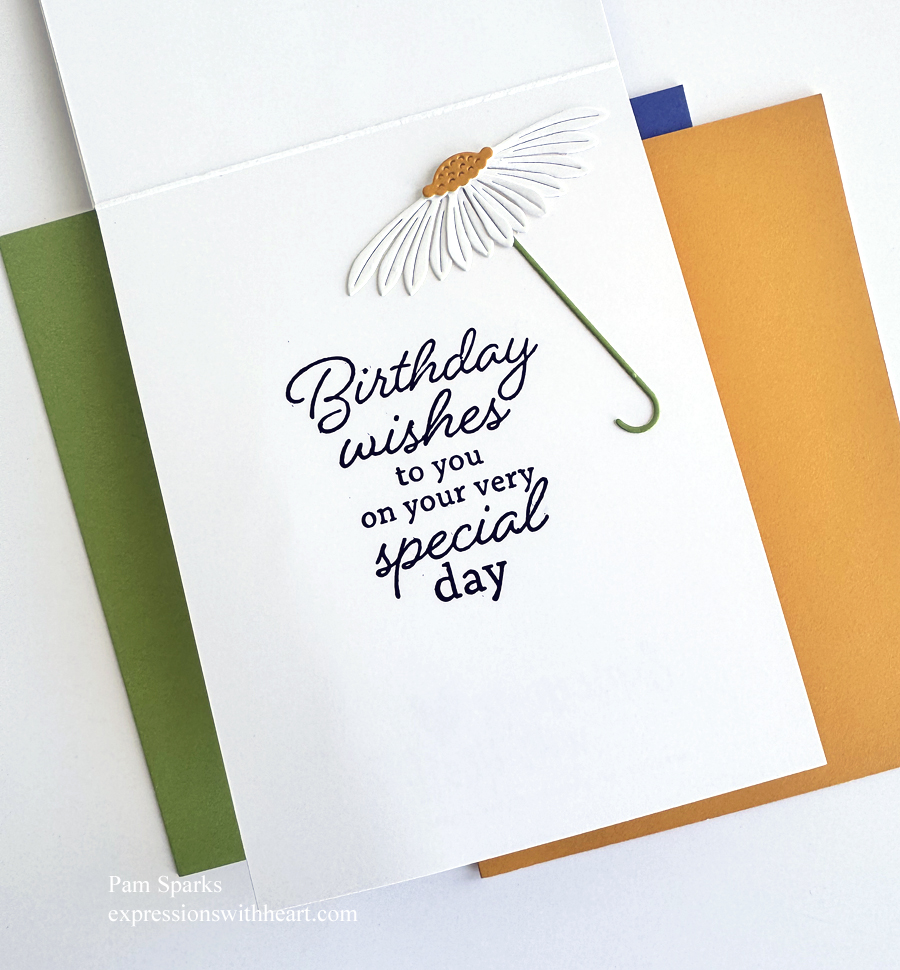I put the extra Daisy inside with the sentiment! Birthday Wishes is from an older 2021 Memory Box Joyful Moments stamp set. I cut off the ‘sending’ word at the top because most of the birthday cards I use I don’t send!