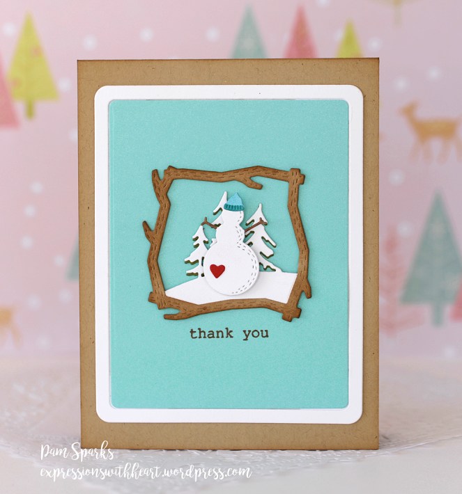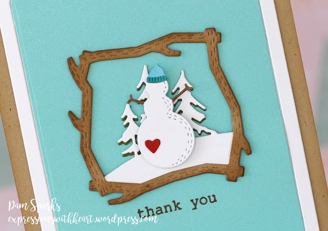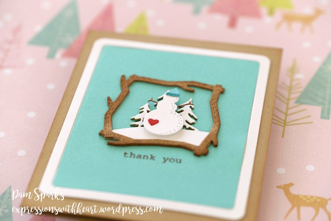 This picture captures the color the best and shows the touch of dimension I added by mounting the new poppystamps Whittle Snowman with foam tape. I layered 3 of the Whittle Wood Frames together and layered a white cut and a green cut of the poppystamps Tree Line Hill die. I colored his cap with Copics!