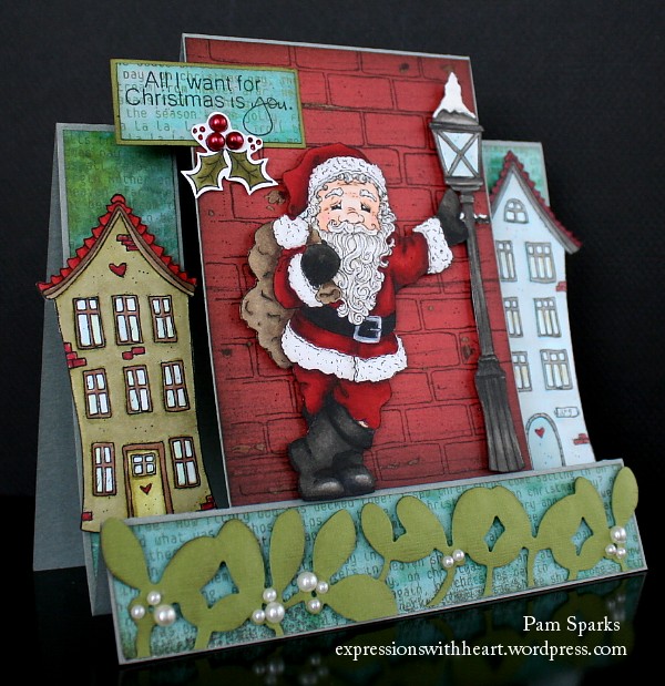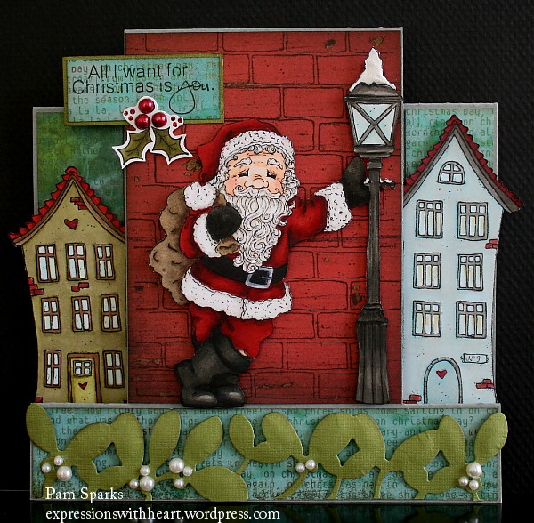 I used labels 14 for the holly, heart, pine embellishment and my new Waltzingmouse Labels 14 stamp set. The papers are October Afternoon, Very Merry set, from last year. The gingerbread border is a Martha Stewart punch. The snowflakes and holly are an EK Success punch The holly border is an Anna Griffin paper ribbon from M’s. Cherry Cobbler and Chocolate Chip cardstock from Stampin Up. The circles are cut with Nestabilities Circle and Scallop circle dies.