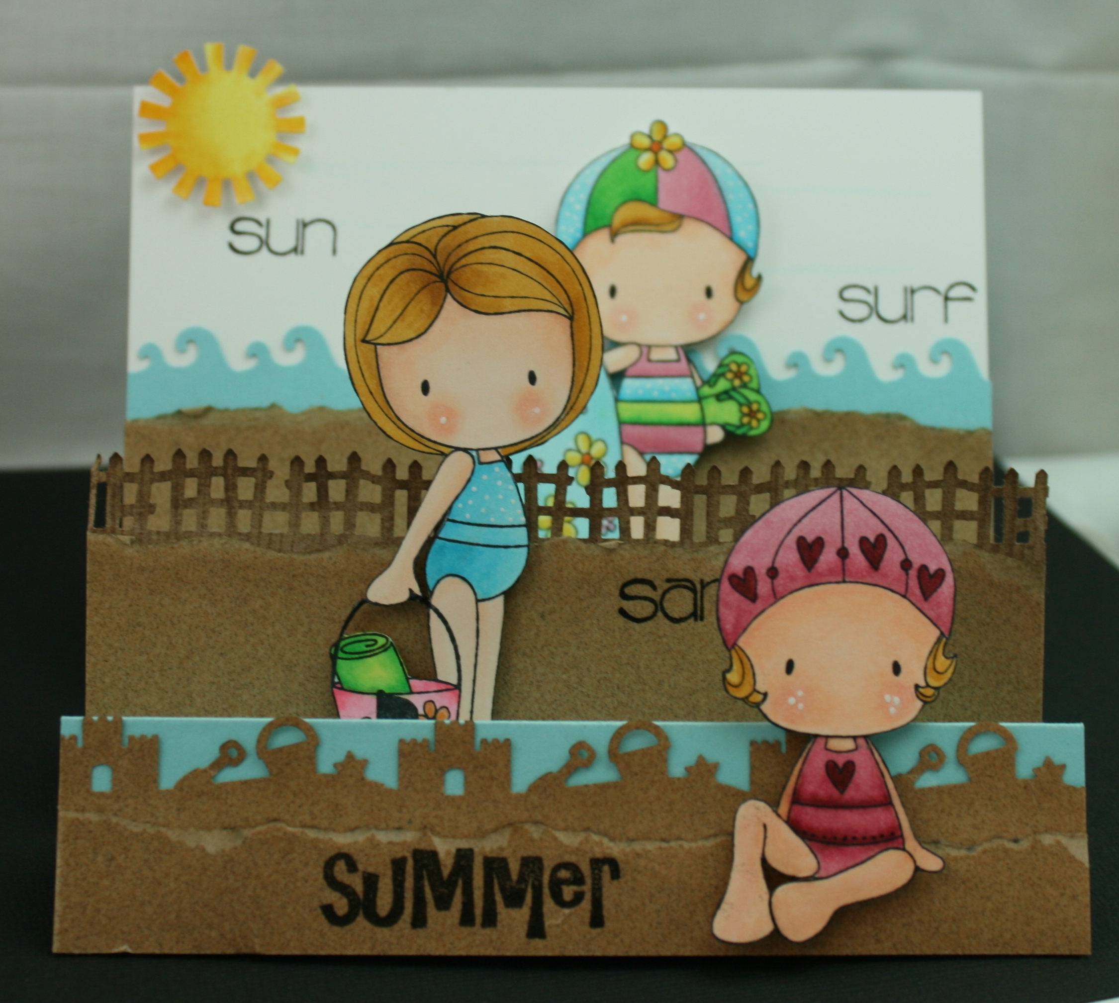 The kitty decorating the tree, the bunny hanging an ornament and the doggy getting all wound up in the lights! I used everything in the set except the words “Merry Christmas” to make this Diorama card. Not sure you can really see how fun it is by my photos! I did mine different than the tutorial…figures…hehe…I thought they left too much at the sides, so I cut it down to 1 1/4 inches. I also made it a 5×7 size.