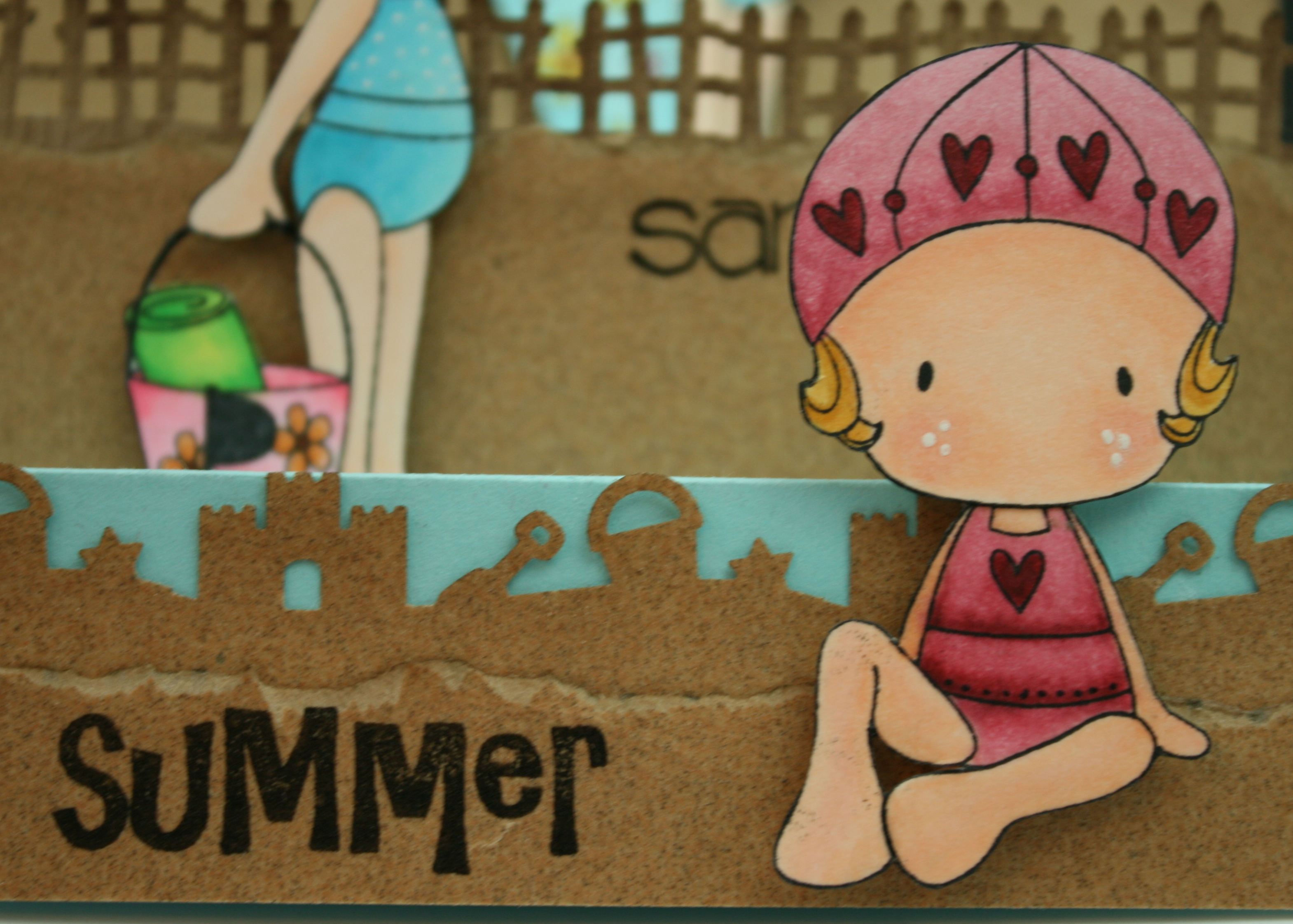 For this card I used this wonderfully, Winterish pattern paper from American Crafts. The snowflakes are embossed already! I cut a strip from the Gingerbread House sheet and punched the bottom with an EK Success Slim border punch. The snowflakes and holly are from an EK Success Winter punch set that is just new. The pine branch is a Martha Stewart punch. I used mini brads for the berries with a little slash of white pen. I do like to dry emboss lines in my leaves and I use a mouse pad and a stylus to do that. The sentiment stamps I used here is new from All That Scraps also, watch for the set called Christmas card Greetings! I used the Bazzill itty bitty brads for her pigtail holders…they’re about 1/16th of an inch and I LOVE them!