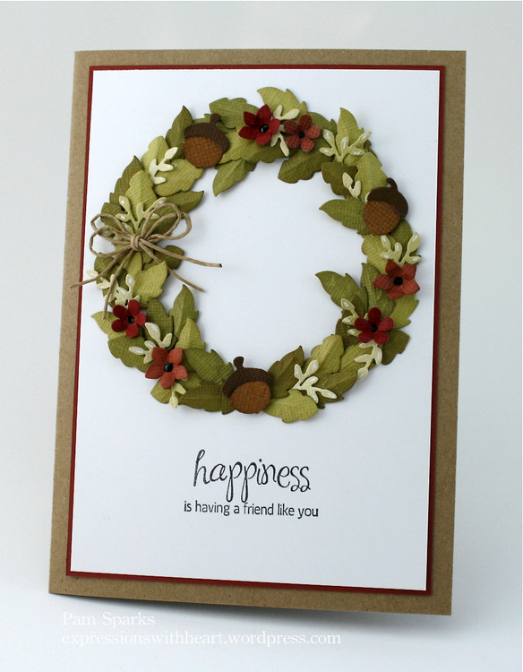 I used my favorite die ever to look like tree branches up in the left corner and sprigs down with the sentiment. The little flowers I used today are from a Martha Stewart border punch… teeny four leaf sweeties. I lay them on a mouse pad and push down in the center with the smallest tip embossing stylus. I did put a black mark in the center and a teeny bit of R81 too.