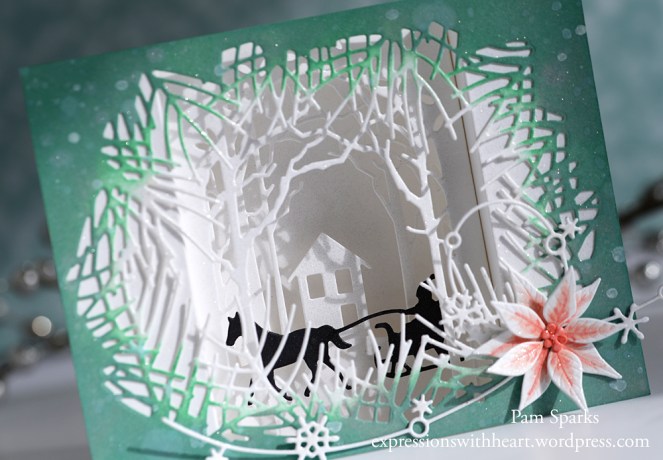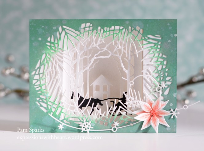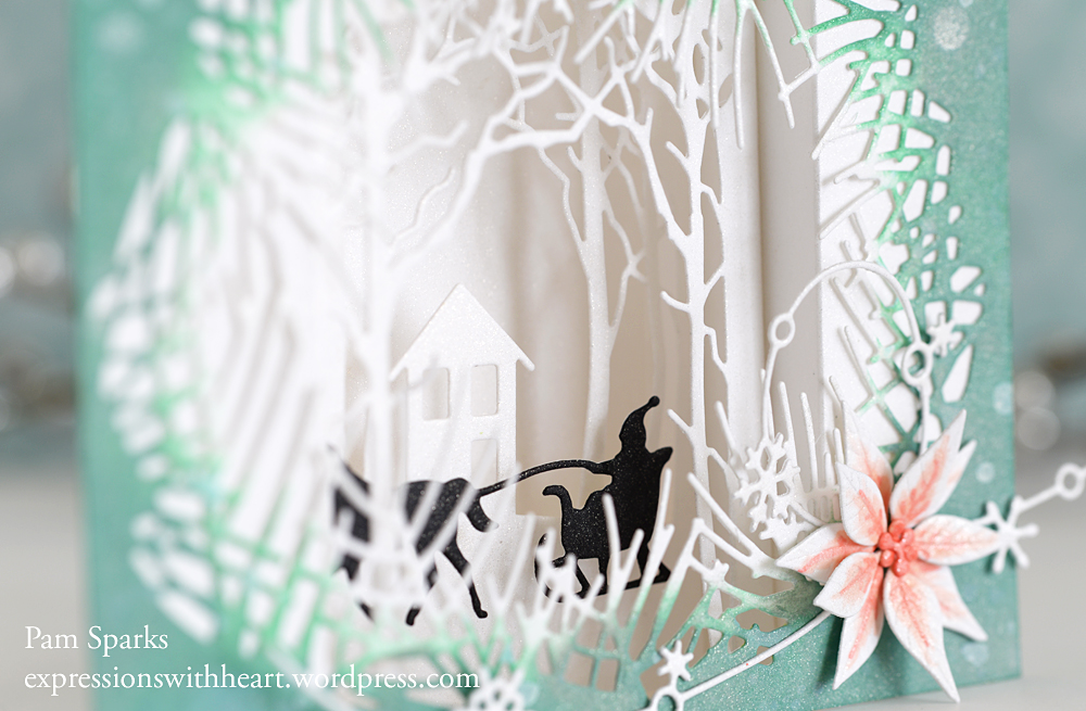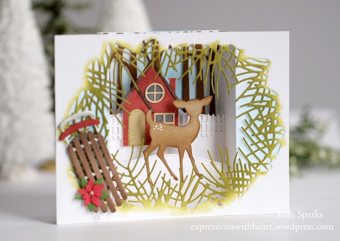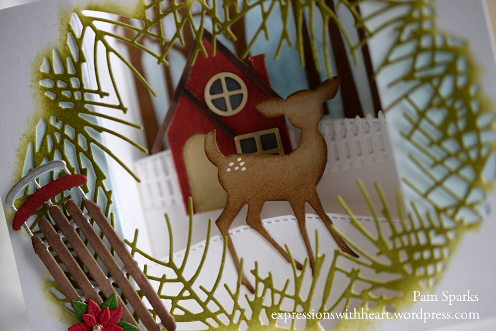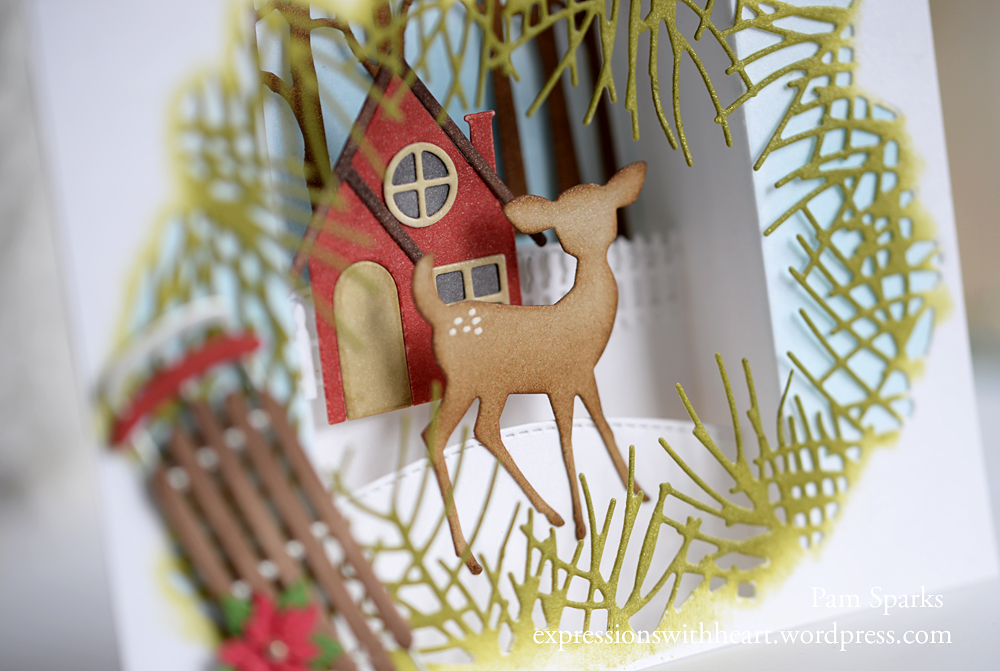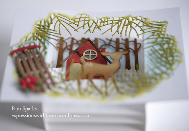 The tree trunks cut is mounted directly to the cardbase with strips of thin mounting tape. The fence and cottage are mounted to a snow hill. The deer (legs) are glued directly to a snow hill. The pine needles cut is glued directly to the card base and the fence is mounted to the top with thin mounting tape foam.