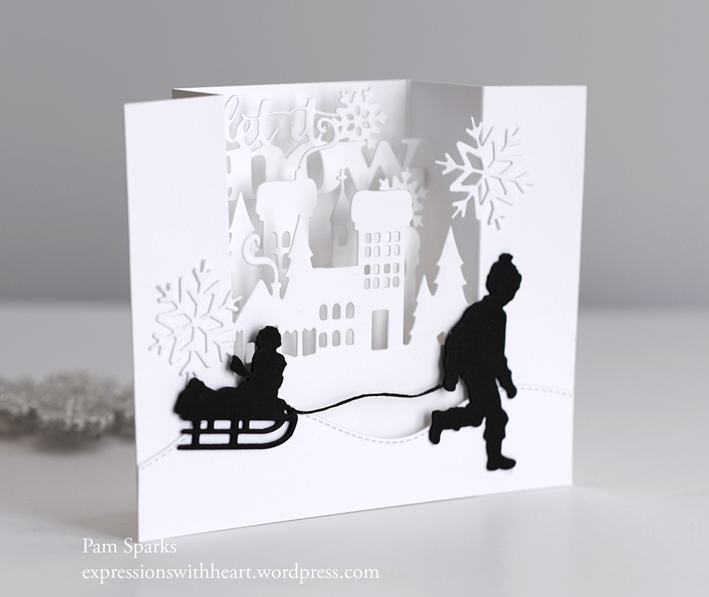 I die cut the Memory Box Small Winter Sled from the same white cardstock and colored it with Copics (E40’s, E07) and a silver gel pen. I die cut poppystamps Poinsettia Mini from the same white cardstock and colored the largest with Copic YG67 and the smaller two with Copic R46.