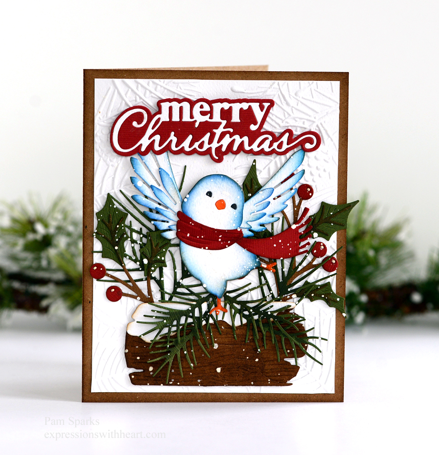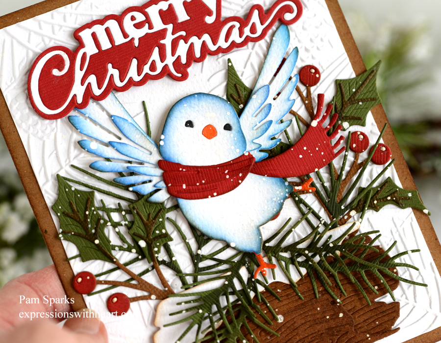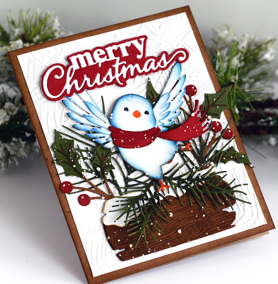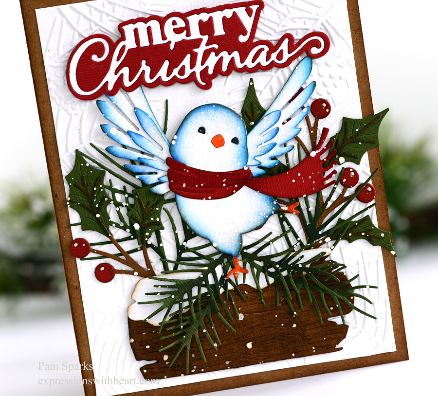 The Happy Dance Bird and Merry Christmas Stylish Script dies are from the newest Memory Box release.  I die cut the bird in white and inked in some blue oxides and then a little gathered twigs too.