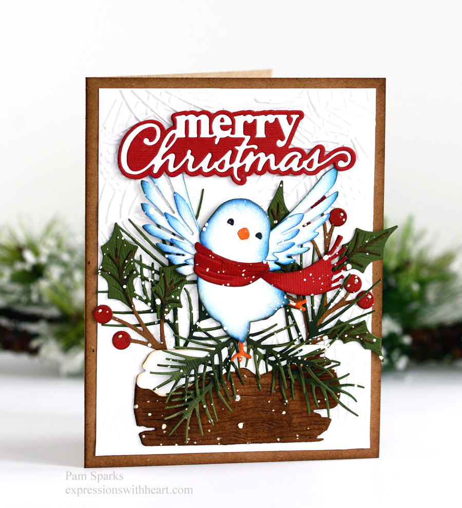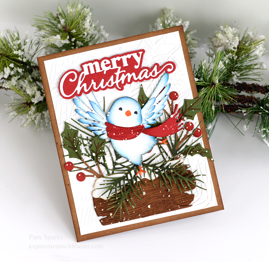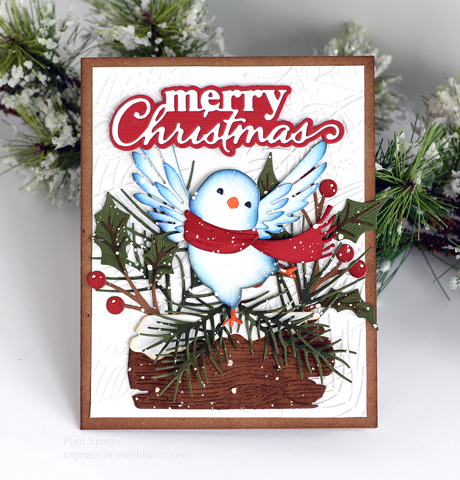 oh happy day, I mean bird! So cute and festive on the snowy log!  I love making Christmas cards with foliage, greenery and brown elements.