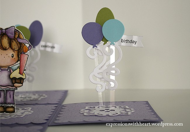 - to get the balloons to stand up, I just took the packaging acetate from the Nestabilities Parisian die set and cut strips about 3/16th in. wide and 3 3/4 in. long.