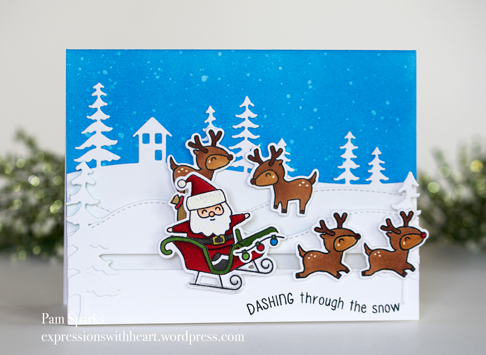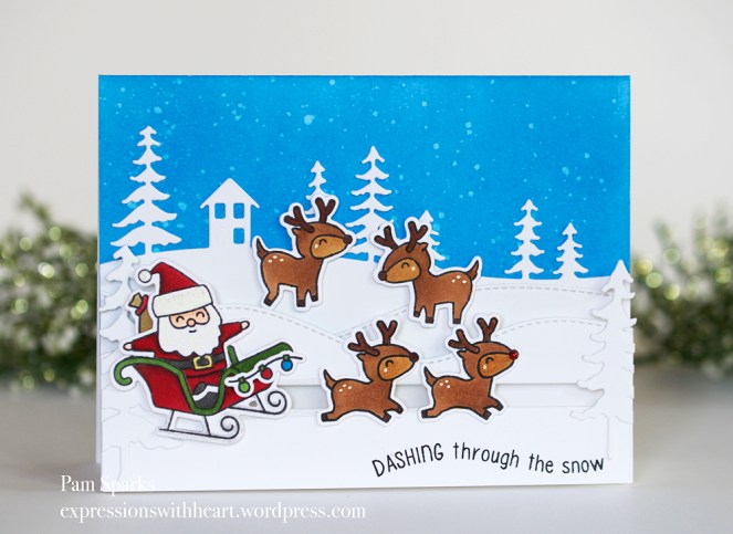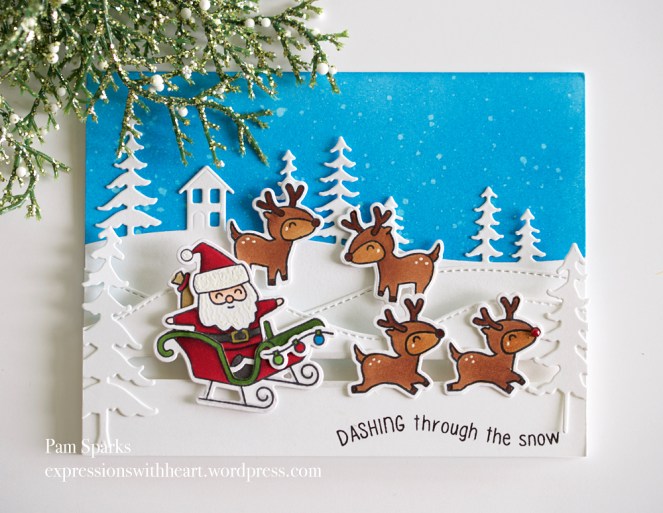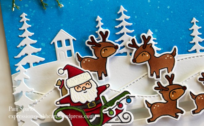 I glued on some Pretty Pink Posh clear sequins and the sentiment die Warm Winter Wishes. It’s two layers of white glued together and a few pieces of foam mounting tape cut thin on the back in a few of the wider places.