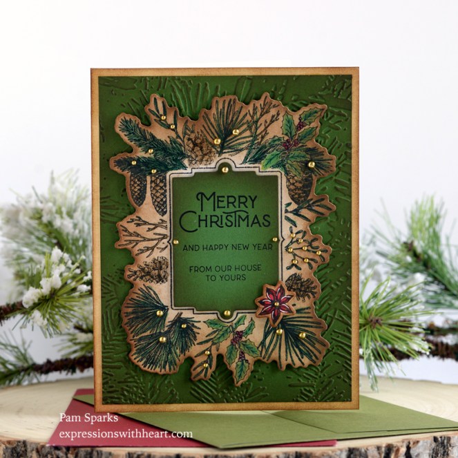 I embossed the Forevergreen Embossing Folder in TE Cilantro cardstock and inked it with Gathered Twigs Distress ink and the mini ink blending tool. I trimmed it down this time so my card would end up A2 size.