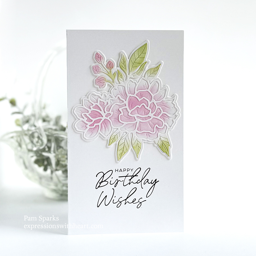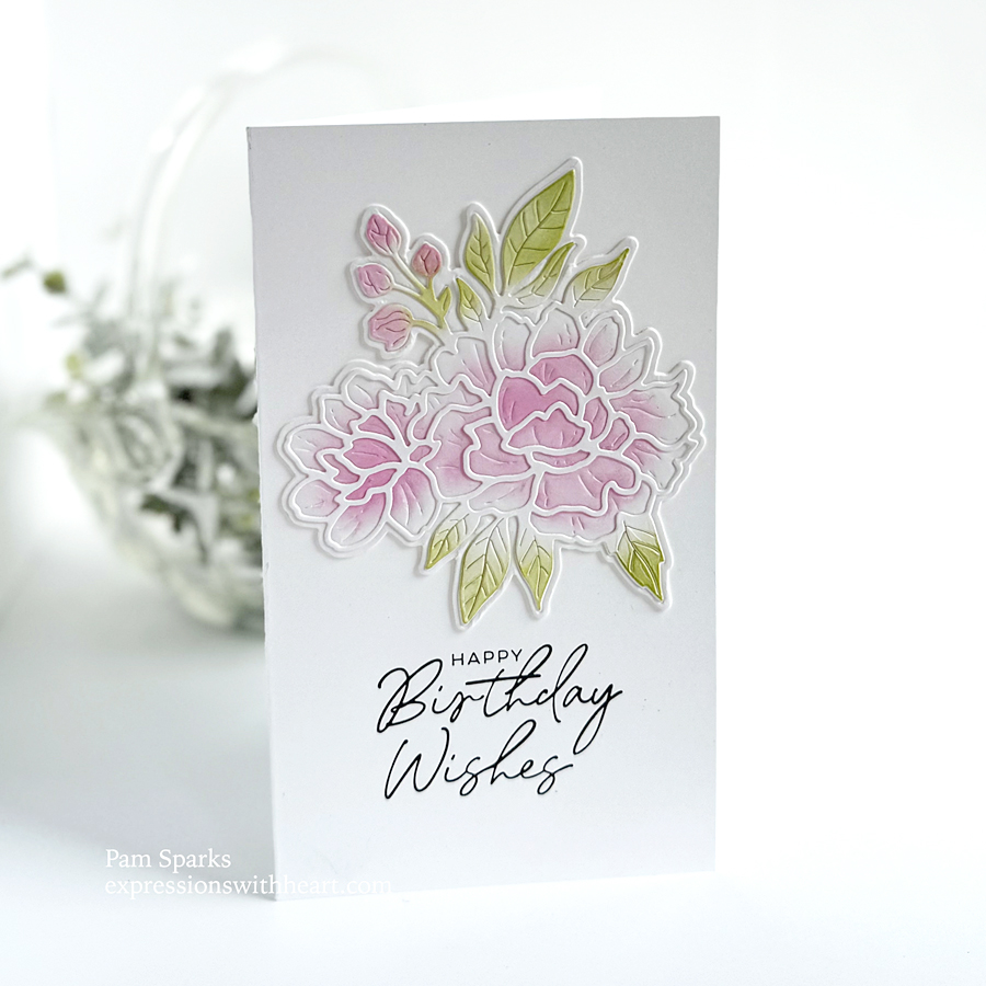 Then the 3D embossing folder is NEW also. It’s called Amaryllis Garden. So pretty! I embossed it in white cardstock, trimmed it down to 5 x 7 size and used my gray inking brush to go around the edges of the panel.