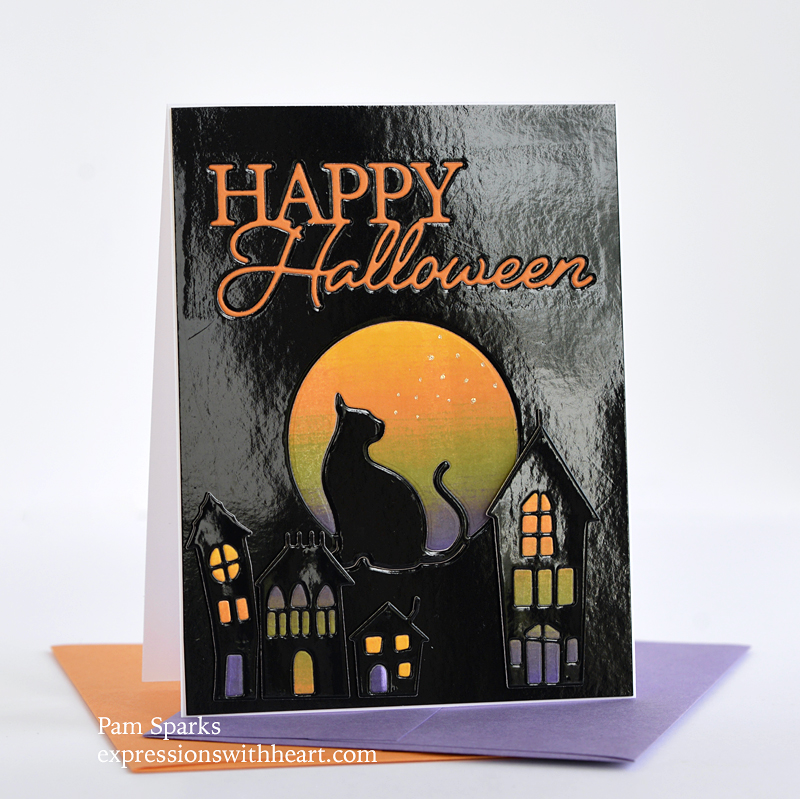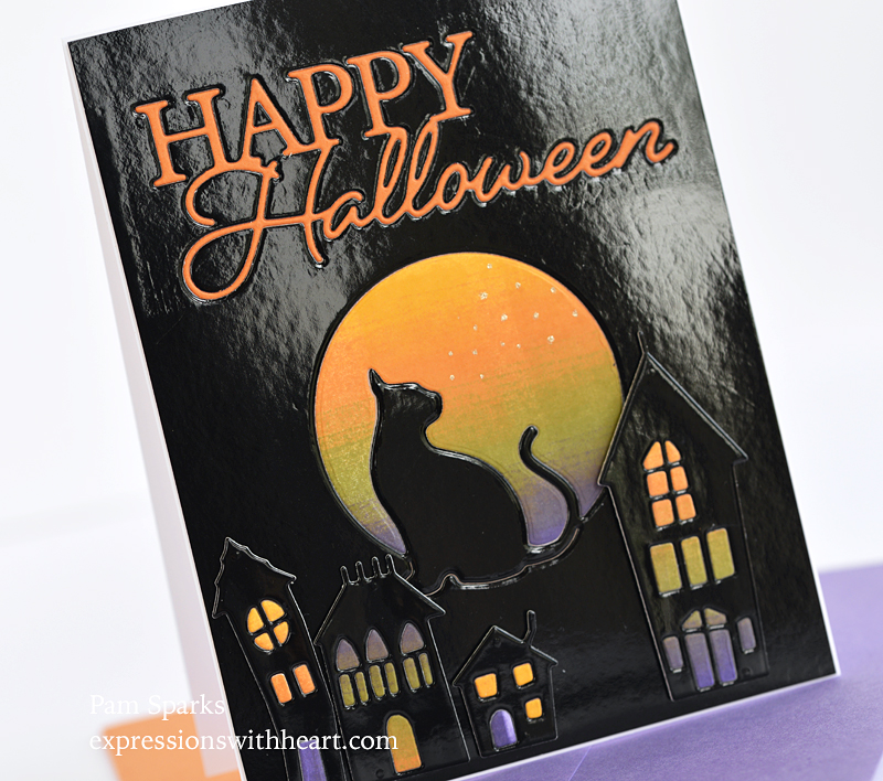 Memory Box NEW Happy Halloween Posh Script die cut directly in the glossy card front panel then an orange die cut inlaid into it.  Be sure to keep the centers of the letters!