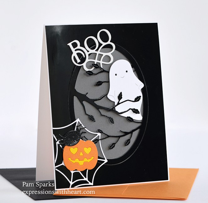 The ghosts are from the NEW Ghosts in the Forest die set and the sentiment is the NEW Boo Posh Script!  So cute!